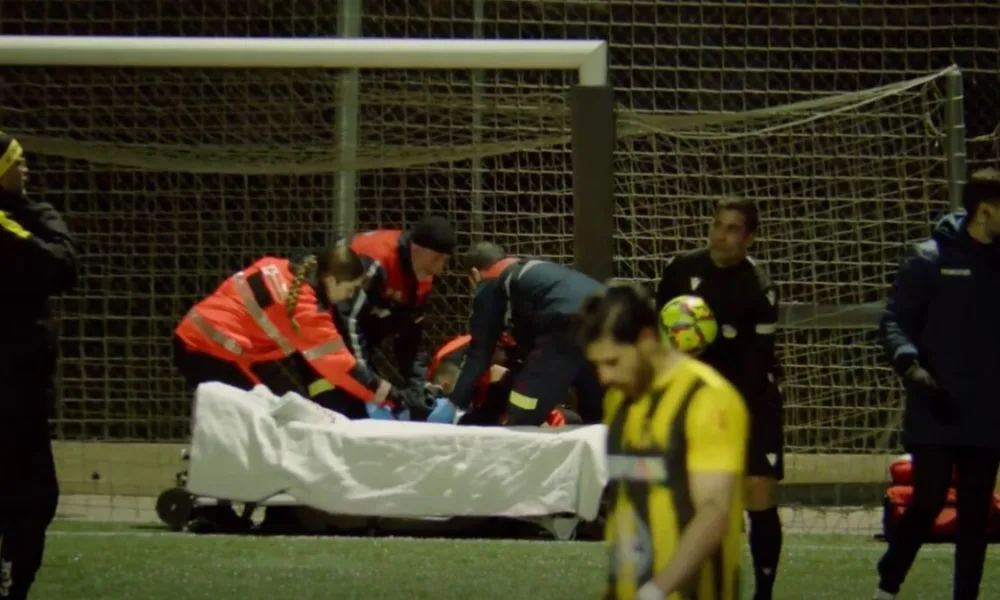 Un jugador del Penya Encarnada, amb una fractura de tíbia i peroné, va haver de ser evacuat sense llitera fins que l’ambulància va travessar el camp...